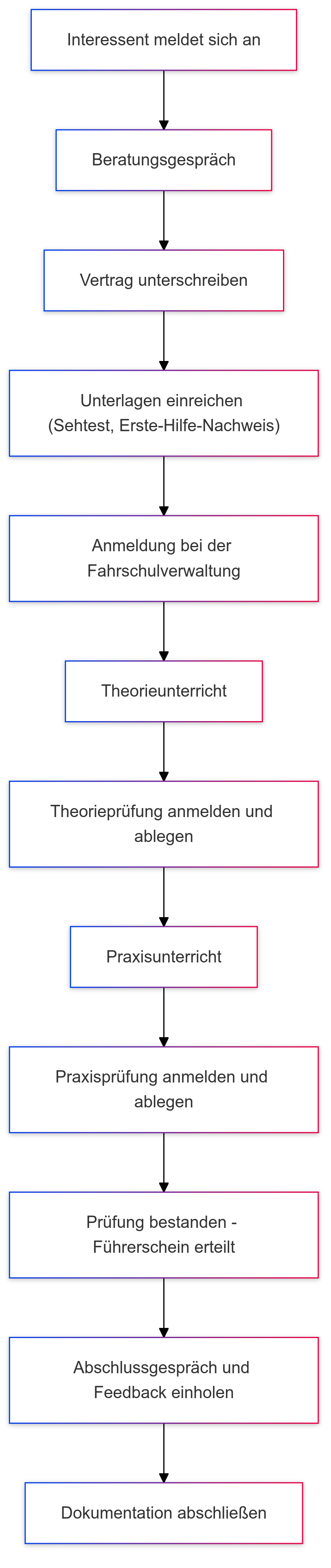 Diese Schritte führen den Fahrschüler systematisch von der Anmeldung bis zur Erteilung des Führerscheins.